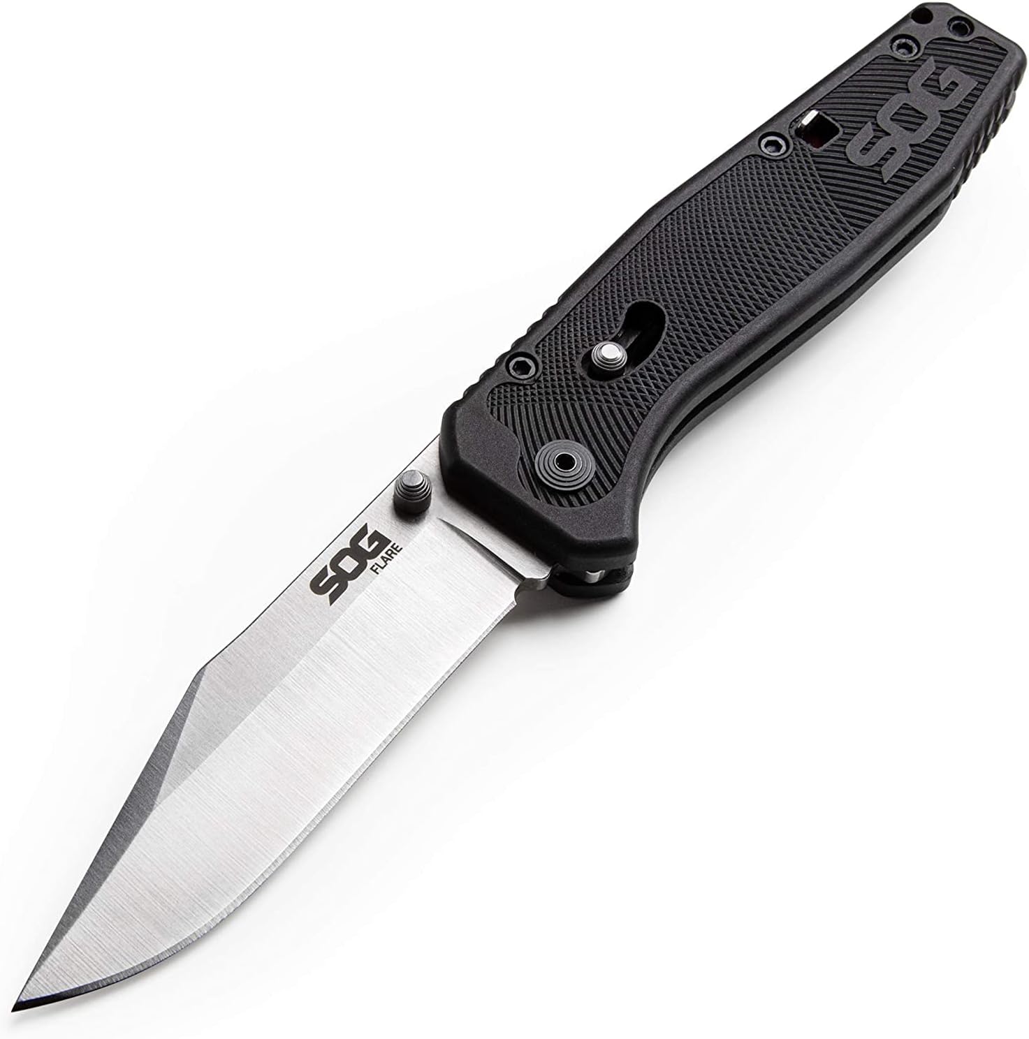 SOG Flare Folding and Pocket Knife Assisted Opening Tech Knife w/ 3.5 Inch Stainless Straight Edge Blade & Tactical Knife GRN Grip (FLA1001-CP). Black